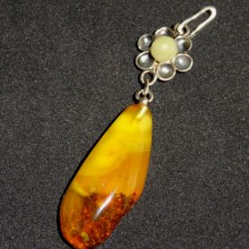 Pendant with silver flower and clear, cognac-colored amber with inclusions